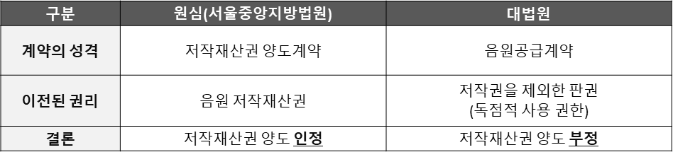 이 사건의 가장 주요한 법적 쟁점은 “음원공급계약은 '저작재산권 양도계약'인가, 아니면 '저작재산권 이용허락계약'인가”였습니다.