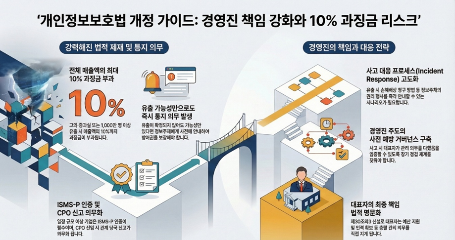 이에 정부는 반복적이거나 중대한 침해 행위에 대해 보다 강력한 과징금 제도를 도입하고, 경영진의 총괄적 관리 의무를 명시함으로써 현행 제도의 미비점을 보완하였습니다. 2026년 3월 10일 공포된 개정 개인정보 보호법은 개인정보 보호를 실무 차원의 업무를 넘어 경영진의 핵심적인 관리 과제로 격상시켰습니다.