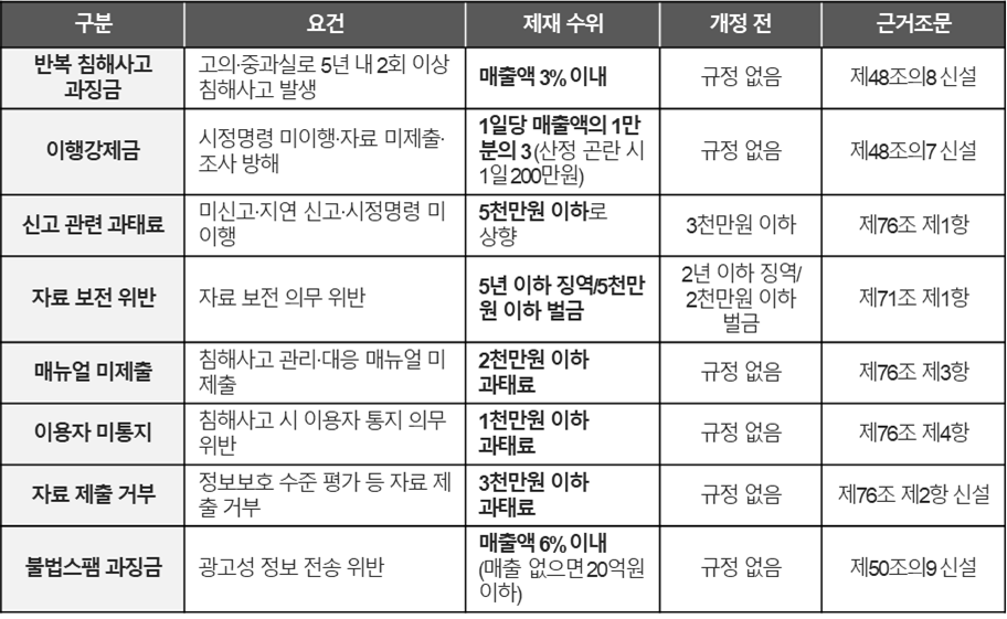 이번 개정의 핵심적 변화 중 하나는 침해사고가 직접적 재무 손실로 전환되었다는 점입니다. 기존에는 사후적 과태료 중심의 제재에 그쳤으나, 개정법은 매출액 연동 과징금과 일단위 이행강제금이라는 이중의 재무적 제재 수단을 도입하였습니다.