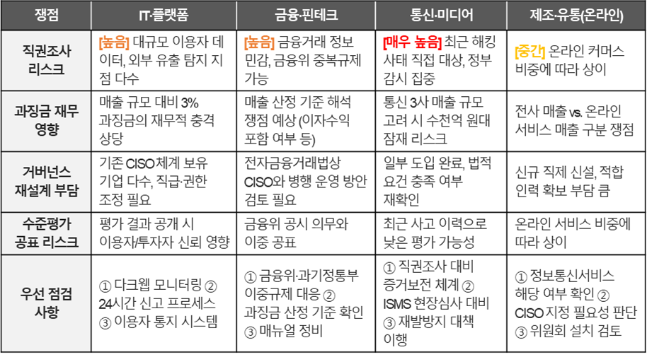 이번 개정안은 정보통신서비스를 제공하는 기업 전반에 적용되나, 산업별로 기존 보안 거버넌스 성숙도, 이용자 데이터 규모, 감독기관 중복 여부에 따라 영향의 범위와 대응 우선순위가 상이합니다.