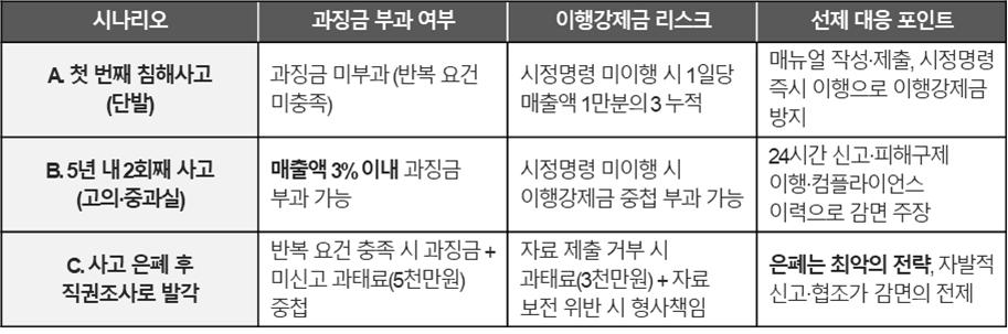 과징금 감면 전략: 과징금 산정 시에는 ① 위반행위의 내용·정도, ② 기간·횟수, ③ 피해 규모, ④ 피해구제 조치 이행 여부 등 7개 고려사항이 감면 변수로 작동합니다. 따라서 평상시 24시간 이내 신고 체계 구축, 침해사고 관리·대응 매뉴얼 작성·제출, 이용자 통지 인프라 확보, 피해구제 조치 신속 이행 등 사전 컴플라이언스 체계를 갖추는 것이 사고 발생 시 과징금 감면의 실질적 근거가 됩니다.