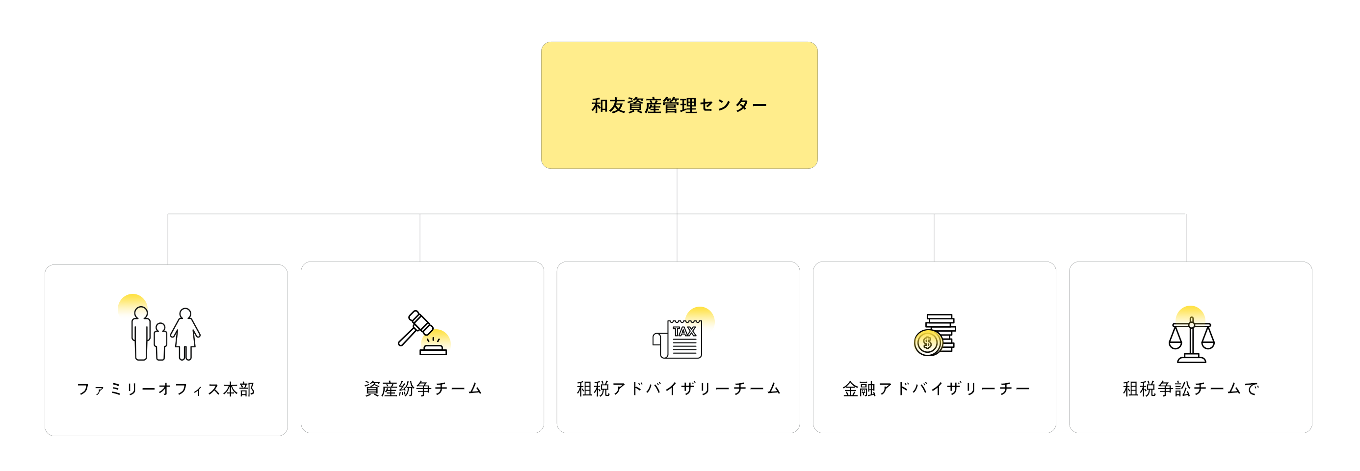 和友の資産管理センターは、資産承継、家業(企業経営権)の承継、企業支配構造の再編、信託商品の開発及び信託に係るアドバイザリー業務、資産管理、相続・贈与税の節税策、相続に係る紛争(相続財産の分割、遺留分の返還など)、離婚、後見などに関する専門的なサービスを提供します。