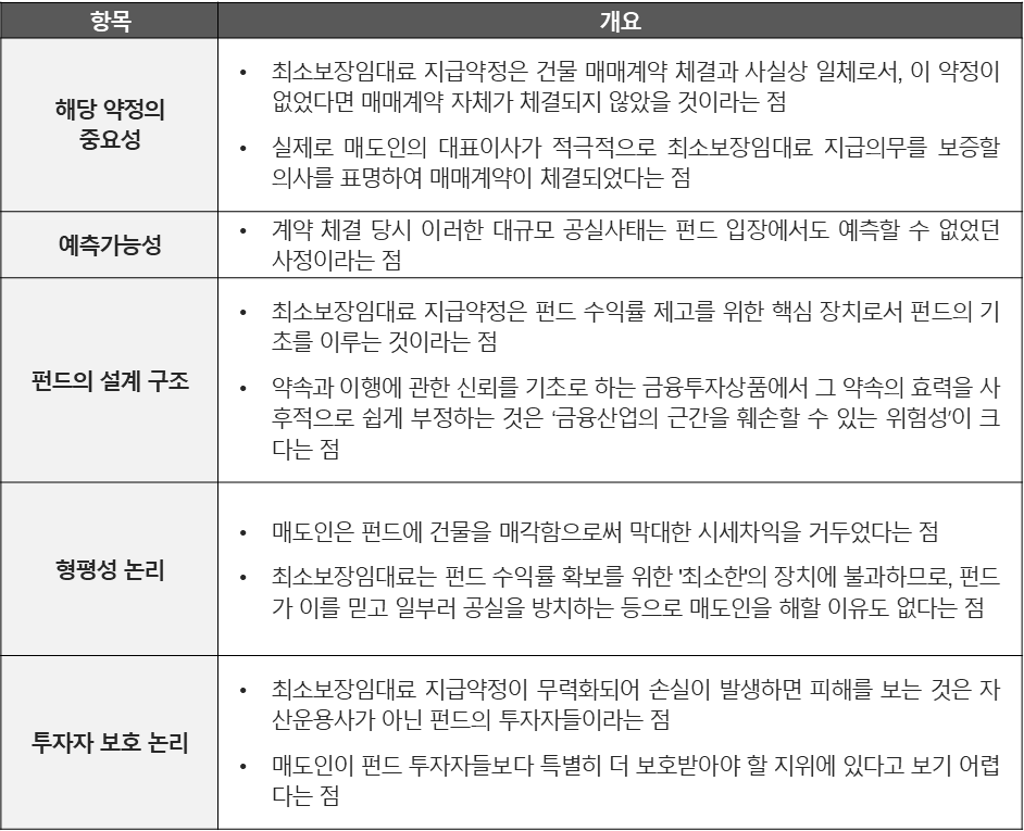 펀드 설계 시 자산운용사는 수익자들에게 일정한 수익을 보장하기 위한 핵심 장치로서 매도인과 사이에 건물의 임대수익이 일정 수준에 미달할 경우 그 차액을 매도인이 지급하도록 보장하는 내용의 “최소보장임대료 지급약정”을 체결하였습니다.