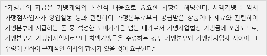 대법원은 다음과 같은 법리를 제시하며 차액가맹금 수령에 구체적 합의가 필요함을 명확히 하였습니다.