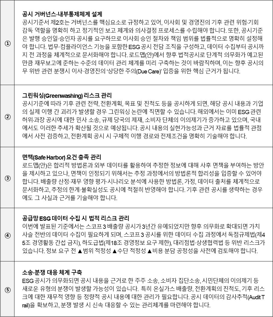 이처럼 ESG 공시 제도화는 단순한 보고 의무를 넘어 기업의 전략, 거버넌스, 법적 리스크 관리 전반에 영향을 미치는 복합적 과제입니다. 기업은 공시 체계 구축 초기 단계에서부터 법률 전문가의 검토를 통해 거버넌스·내부통제체계 설계, 그린워싱 리스크 평가, 면책 요건 충족 관리, 공급망 데이터 리스크 관리, 분쟁 대응 전략 수립 등을 종합적으로 추진하는 것이 바람직합니다.