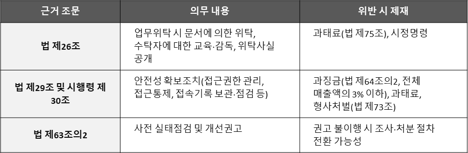 이번 점검 항목은 모두 개인정보 보호법상 위탁자의 안전조치의무 및 수탁자 관리감독의무에서 파생됩니다. 관련 의무 구조는 다음과 같이 정리할 수 있습니다.