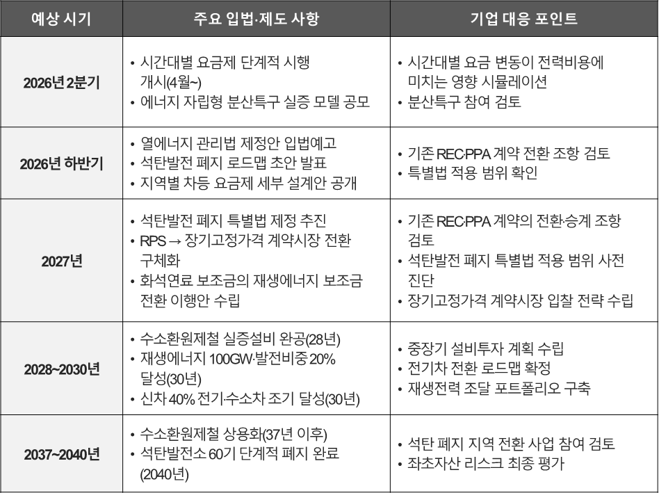 ⑨  전력시장·요금제는 (1) 송전비용·자립도·균형발전을 반영한 지역별 차등 요금제, (2) 시간대별 요금제(2026년 4월부터 단계 시행), (3) RPS를 대체하는 장기고정가격 계약시장 도입으로 재편됩니다. 이는 재생에너지 사업자, 대규모 전력 수요가(데이터센터·반도체·철강), 수도권 소재 기업 모두에 실질적 비용·수익 영향을 미칠 구조 개편입니다.